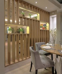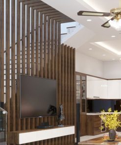 Ngoài lựa chọn vách hoa văn cnc để ngăn phòng khách và bếp thì lam gỗ cùng là lựa chọn được nhiều người lựa chọn.